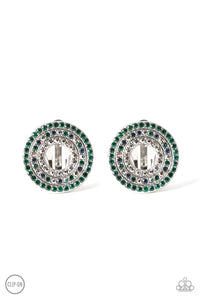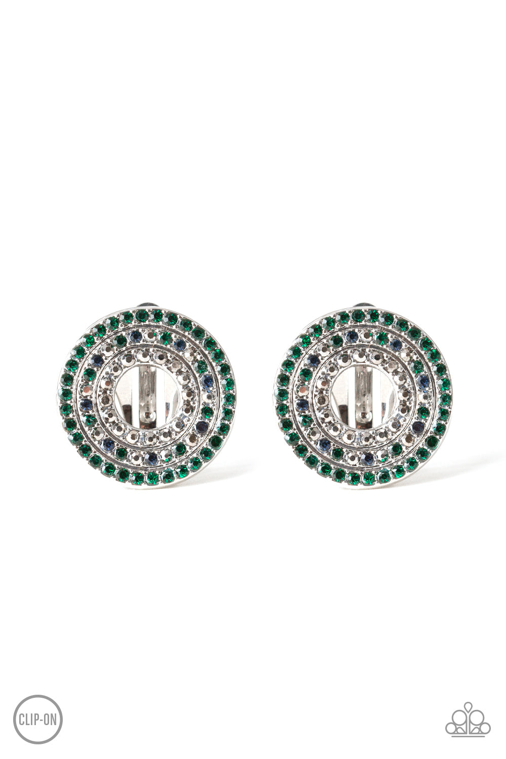 Stacked in glittery rings featuring an array of blue, green and hematite rhinestones, a sparkling silver hoop dots the ear for a refined flair. Earring attaches to a standard clip-on fitting.