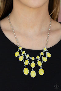 Gradually increasing in size as they cascade down the chest, rows of opalescent yellow gems link together below the collar in a glamorous netted fringe. Features an adjustable clasp closure.